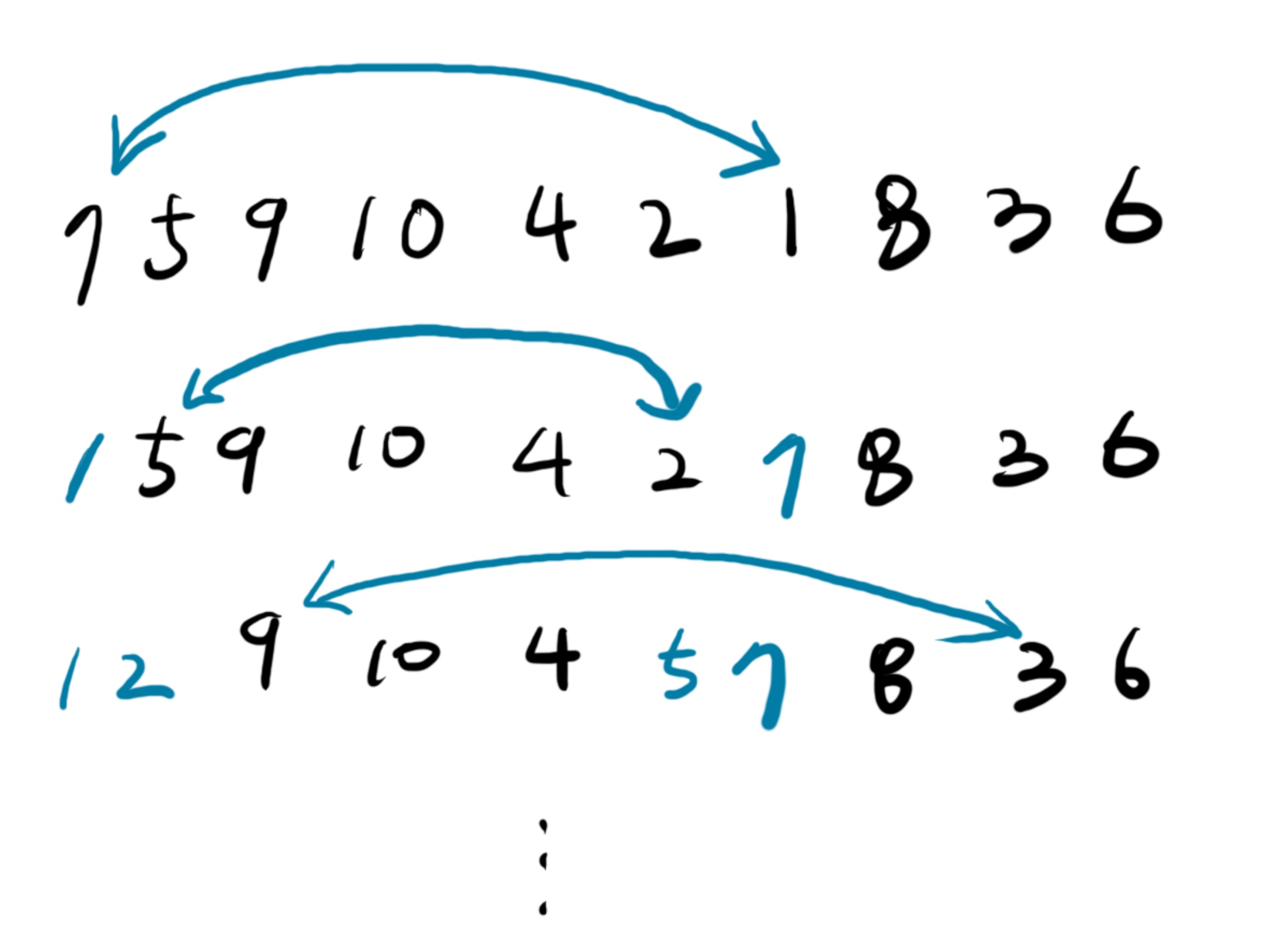 10. 배열의 열번째 자리부터 열번째 자리까지 둘러보며 가장 작은 수(=10)를 찾고, 배열의 열번째 자리의 수(=10)와 교환한다.