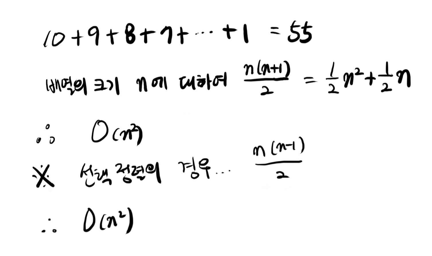 선택정렬은 위에 수행한 각 열번의 과정에서 i번째 연산에서의 i번째 값은 최소값을 담을 변수에 저장만 할 것이므로 (연산하지 않으므로) 선택정렬의 수행횟수 식은 ( N - 1 ) * N / 2 입니다. 따라서 선택정렬의 시간복잡도 역시 O(N^2) 입니다.